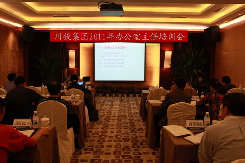 10月12日上午,川投集團(tuán)2011年辦公室主任培訓(xùn)會議在川投國際酒店召開。會議由集團(tuán)公司總經(jīng)理助理、辦公室主任楊強(qiáng)主持,全國知名新聞傳播學(xué)專家、四川省社科院趙志立教授特邀到會授課,集團(tuán)公司辦公室全體同志、各所屬企業(yè)辦公室主任共計50余人參加會議,集團(tuán)公司副總經(jīng)理李文志出席了會議并講話。