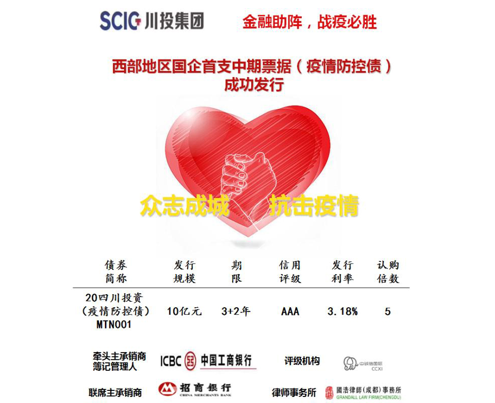 為落實(shí)好疫情防控責(zé)任,多措并舉做好民生保障服務(wù),充分發(fā)揮國(guó)企優(yōu)勢(shì)。2月20日,川投集團(tuán)成功發(fā)行西部地區(qū)國(guó)企首支中期票據(jù)(疫情防控債)10億元,債券期限3+2年,認(rèn)購(gòu)倍數(shù)5倍,發(fā)行利率3.18%,低于當(dāng)期AAA級(jí)同期限企業(yè)債務(wù)融資工具定價(jià)估值80BP,低于同期人民銀行貸款基準(zhǔn)利率157BP,刷新了今年以來(lái)全國(guó)同期限同等級(jí)中票發(fā)行最低價(jià)記錄。