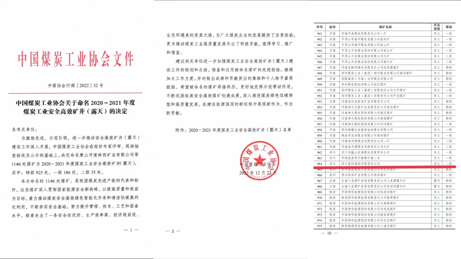 12月22日,根據(jù)《中國(guó)煤炭工業(yè)協(xié)會(huì)關(guān)于命名2020-2021年度煤炭工業(yè)安全高效礦井(露天)的決定》(中煤協(xié)會(huì)行調(diào)〔2022〕32號(hào))文件,嘉陽(yáng)集團(tuán)嘉陽(yáng)煤礦從全國(guó)一千一百多家煤礦企業(yè)中脫穎而出,被命名為全國(guó)煤炭工業(yè)安全高效一級(jí)礦井(露天),蟬聯(lián)這一殊榮。
