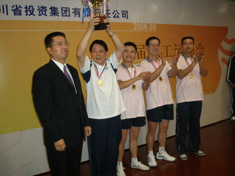 郭總與隊員一道,以其技術(shù)嫻熟、作風(fēng)頑強的比賽風(fēng)格贏得了場外的熱烈掌聲,在集團本部首場比賽中就取得了較好的成績,以3:0戰(zhàn)勝對手紫坪鋪隊。比賽一結(jié)束,郭總不顧疲勞,冒雨來到室內(nèi)第一比賽場地為在那里參加比賽的川投能源和巴蜀電力代表隊鼓勁加油,并與隊員親切握手,鼓勵大家賽出水平、賽出風(fēng)格,取得好成績。