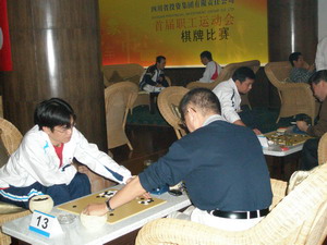 上午8:00,比賽開始。比賽采取積分編排辦法,共進行7輪比賽,各隊以成績最好的3名選手個人名次累計團體名次。賽場上,只見選手們在布局、中局、收官的進程中子力配合標(biāo)準(zhǔn),打吃、尖、跳、飛、靠、斷以及打劫、滾打、倒脫靴等運用得靈活多變,使棋形生動、可觀性強。集團公司總經(jīng)理助理楊勇率集團本部隊參加了比賽。