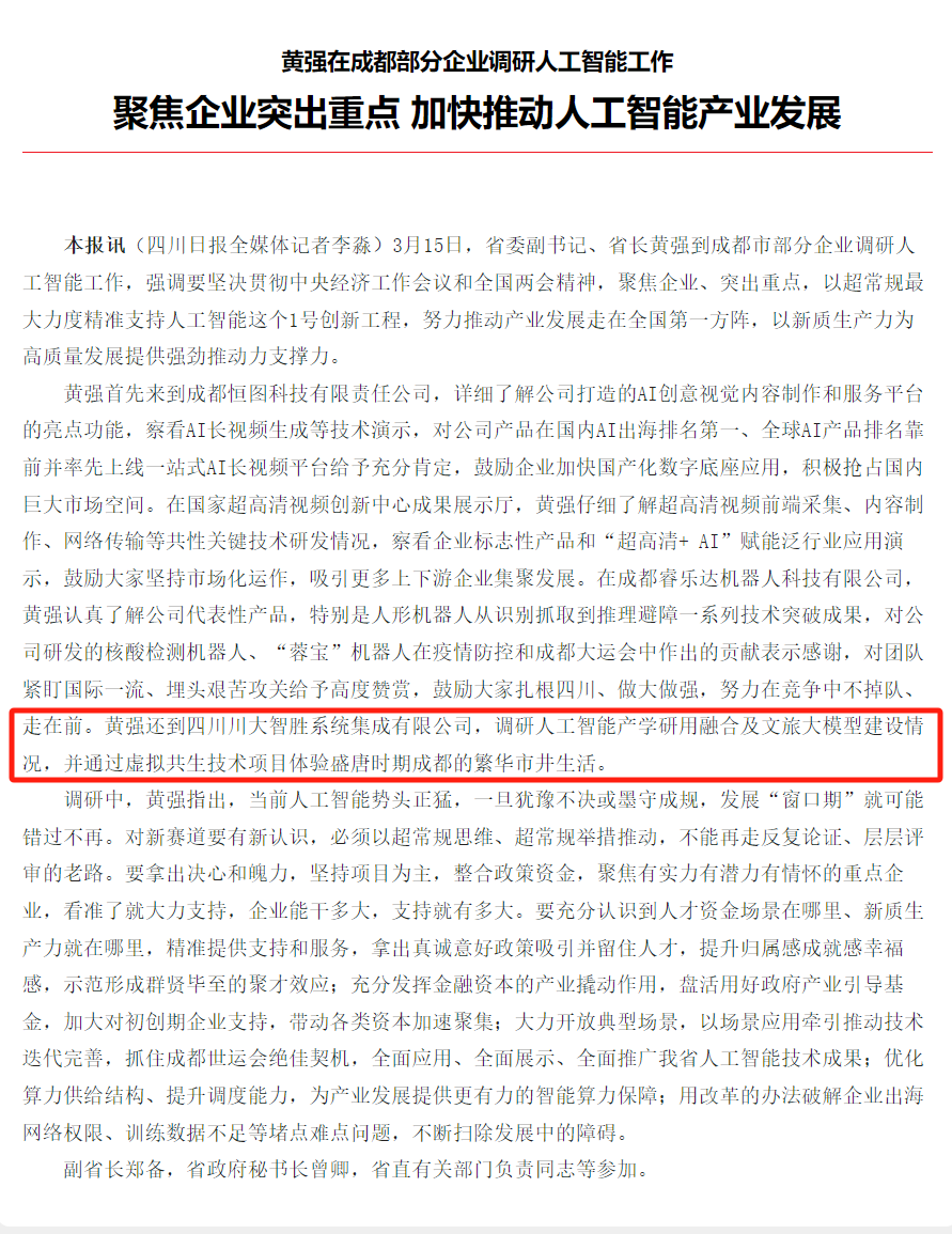 3月15日,省委副書記、省長黃強到成都市部分企業(yè)調(diào)研人工智能工作,強調(diào)要堅決貫徹中央經(jīng)濟工作會議和全國兩會精神,聚焦企業(yè)、突出重點,以超常規(guī)最大力度精準(zhǔn)支持人工智能這個1號創(chuàng)新工程,努力推動產(chǎn)業(yè)發(fā)展走在全國第一方陣,以新質(zhì)生產(chǎn)力為高質(zhì)量發(fā)展提供強勁推動力支撐力。