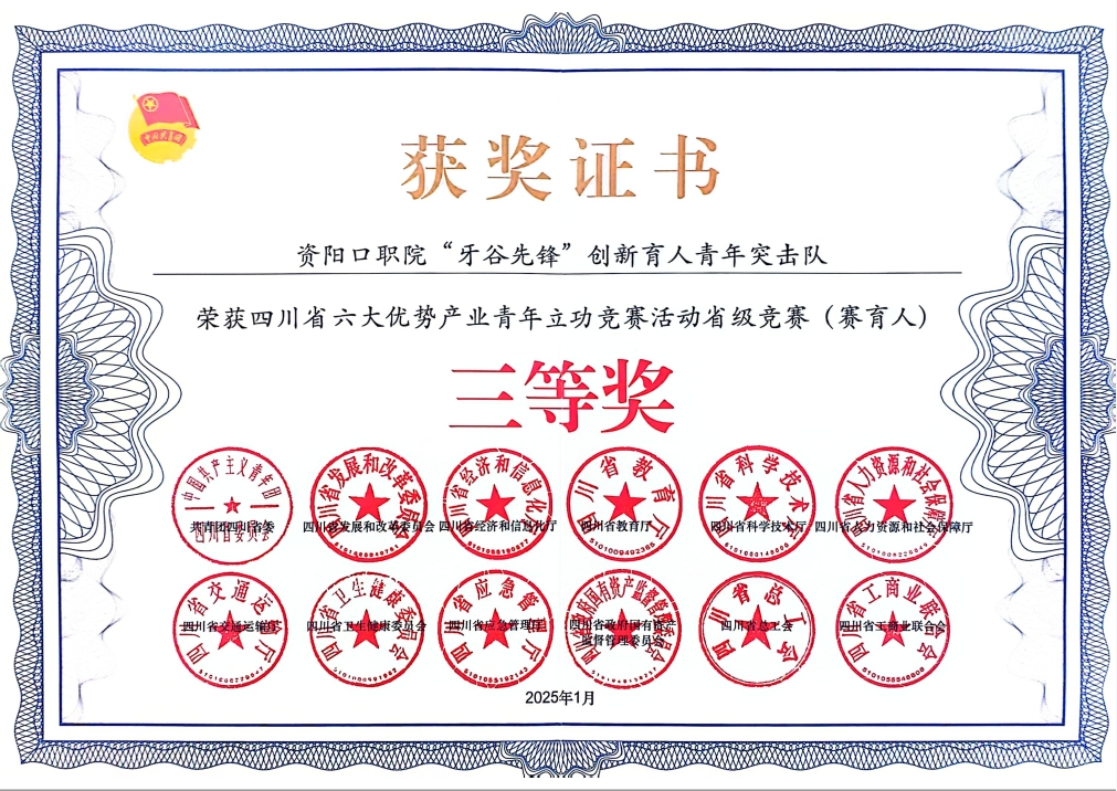 1月8日,四川省六大優(yōu)勢(shì)產(chǎn)業(yè)青年立功競(jìng)賽活動(dòng)頒獎(jiǎng)儀式在成都舉行。川投銀江青年突擊隊(duì)、資陽(yáng)口職院“牙谷先鋒”創(chuàng)新育人青年突擊隊(duì)從全省415支青年突擊隊(duì)中脫穎而出,分別榮獲賽創(chuàng)新、賽育人三等獎(jiǎng)。