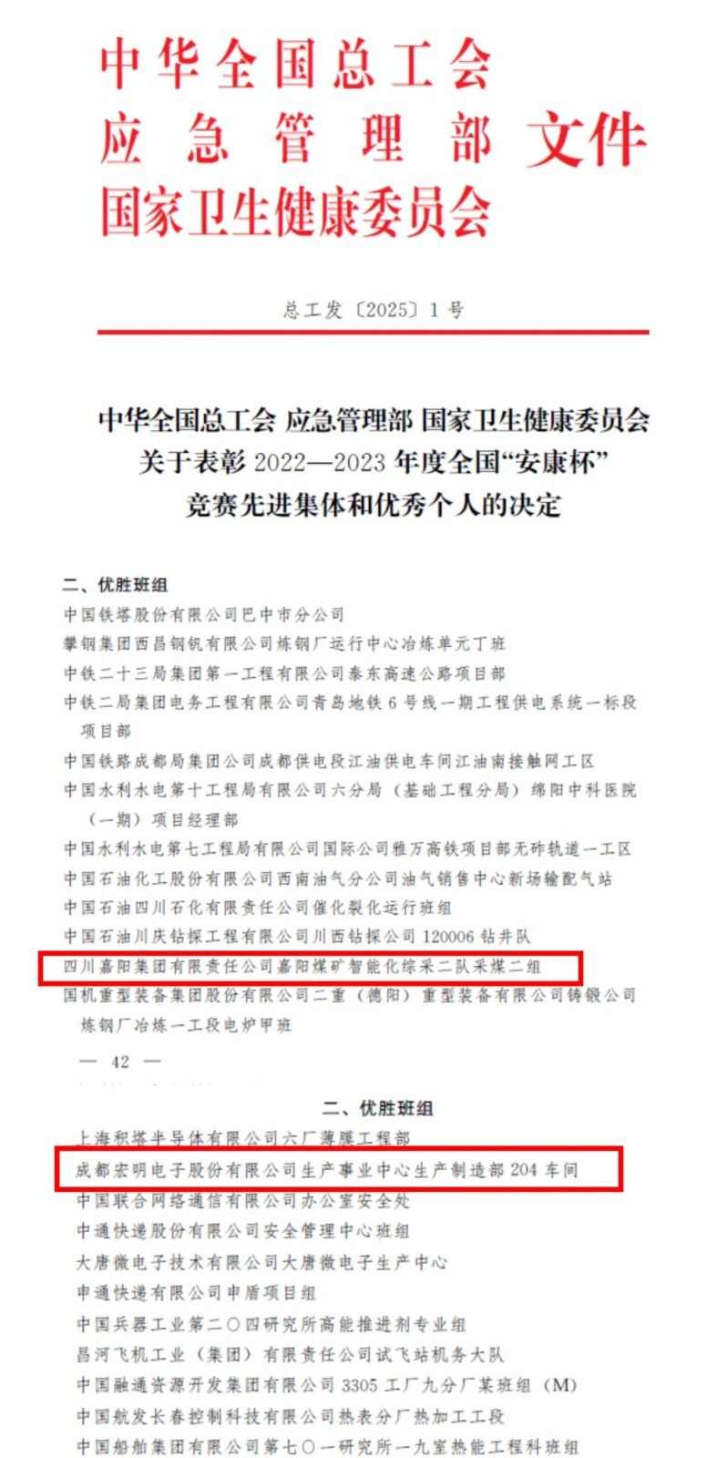 近日,中華全國總工會(huì)、應(yīng)急管理部、國家衛(wèi)生健康委員會(huì)聯(lián)合發(fā)布了《關(guān)于表彰2022-2023年度全國“安康杯”競賽先進(jìn)集體和優(yōu)秀個(gè)人的決定》,川投集團(tuán)所屬嘉陽集團(tuán)嘉陽煤礦智能化綜采二隊(duì)采煤二組和川投信產(chǎn)宏明電子生產(chǎn)事業(yè)中心生產(chǎn)制造部204車間榜上有名,分別獲評(píng)全國“安康杯”競賽優(yōu)勝班組。
