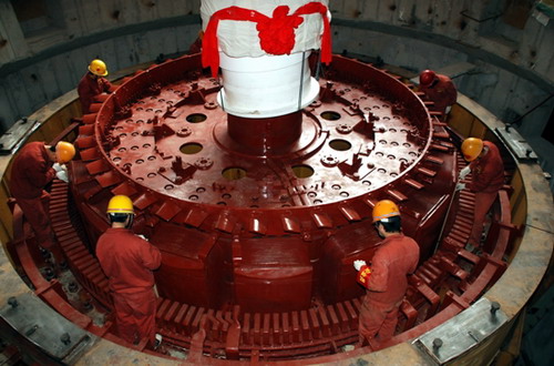 2#發(fā)電機組由東方電機股份有限公司制造,廠家于2008年2月23日開始在現(xiàn)場進行組裝。轉子外徑4.838米,大軸高9.125米、磁極高2.31米,總重260噸,發(fā)電功率12萬千瓦。近一個月來,在公司的統(tǒng)一協(xié)調下,在設計、監(jiān)理、施工及制造廠等各參建單位的通力配合及共同努力下,按期完成了2#發(fā)電機組轉子吊裝前的各項工作。