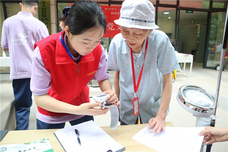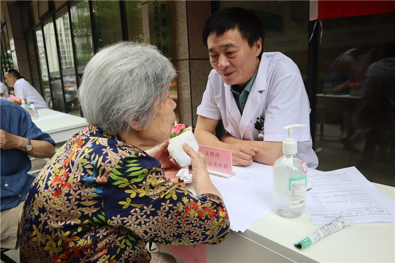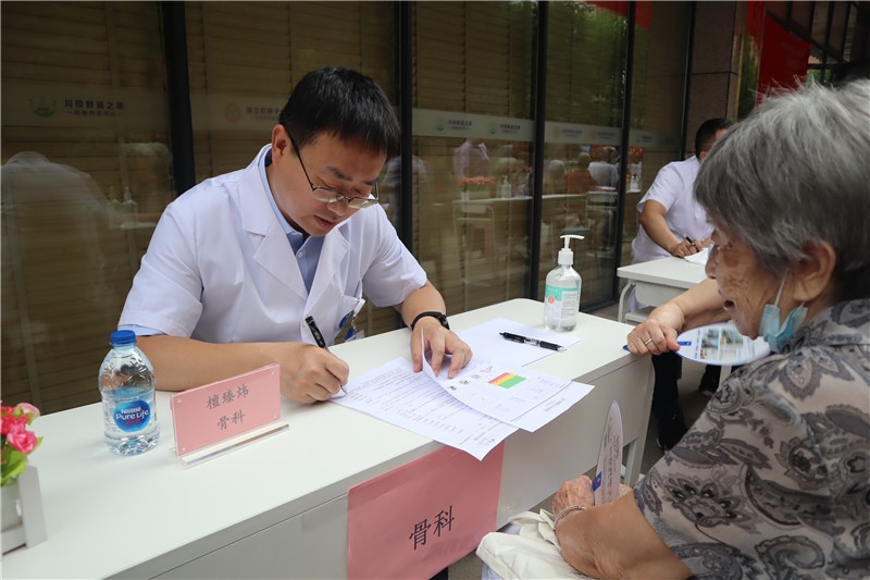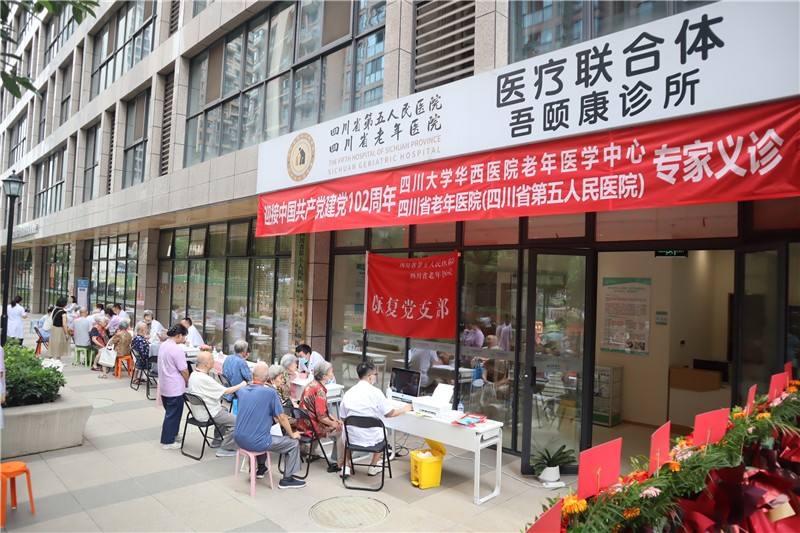 開業(yè)當天,為慶祝建黨102周年,弘揚偉大建黨精神,四川大學華西醫(yī)院老年醫(yī)學中心、四川省老年醫(yī)院的多名專家在現(xiàn)場開展“迎接中國共產(chǎn)黨建黨102周年”主題的健康義診活動,為長者提供健康診療、老年病評估、中醫(yī)診脈服務,并向長者科普疾病預防、健康管理及心理衛(wèi)生等方面知識。