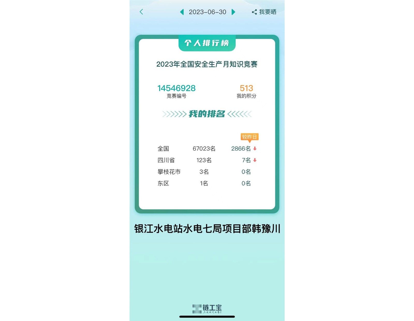 在“鏈工寶”2023年全國安全生產月知識競賽活動中,攀枝花市前10名中,銀江水電站占3人,東區(qū)前10名中,銀江水電站占6人,有效檢驗了安全生產月活動成果,充分體現(xiàn)了銀江水電站學安全、講安全的濃厚安全生產氛圍,進一步強化了廣大工程參建人員的安全生產意識。