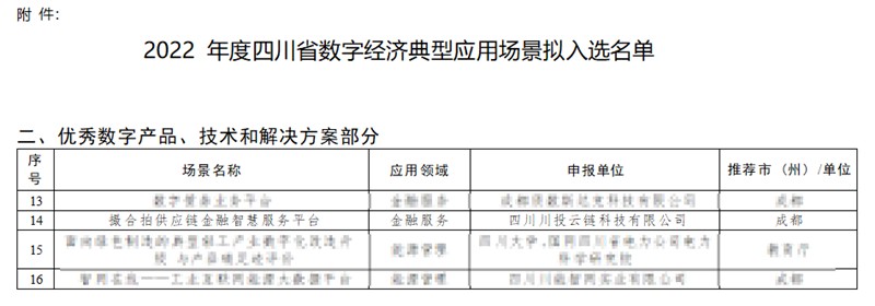 近日,四川省經(jīng)濟(jì)和信息化廳發(fā)布2022年度四川省數(shù)字經(jīng)濟(jì)典型應(yīng)用場景擬入選名單,川投信產(chǎn)所屬川投云鏈旗下“撮合拍供應(yīng)鏈金融智慧服務(wù)平臺”成功上榜。