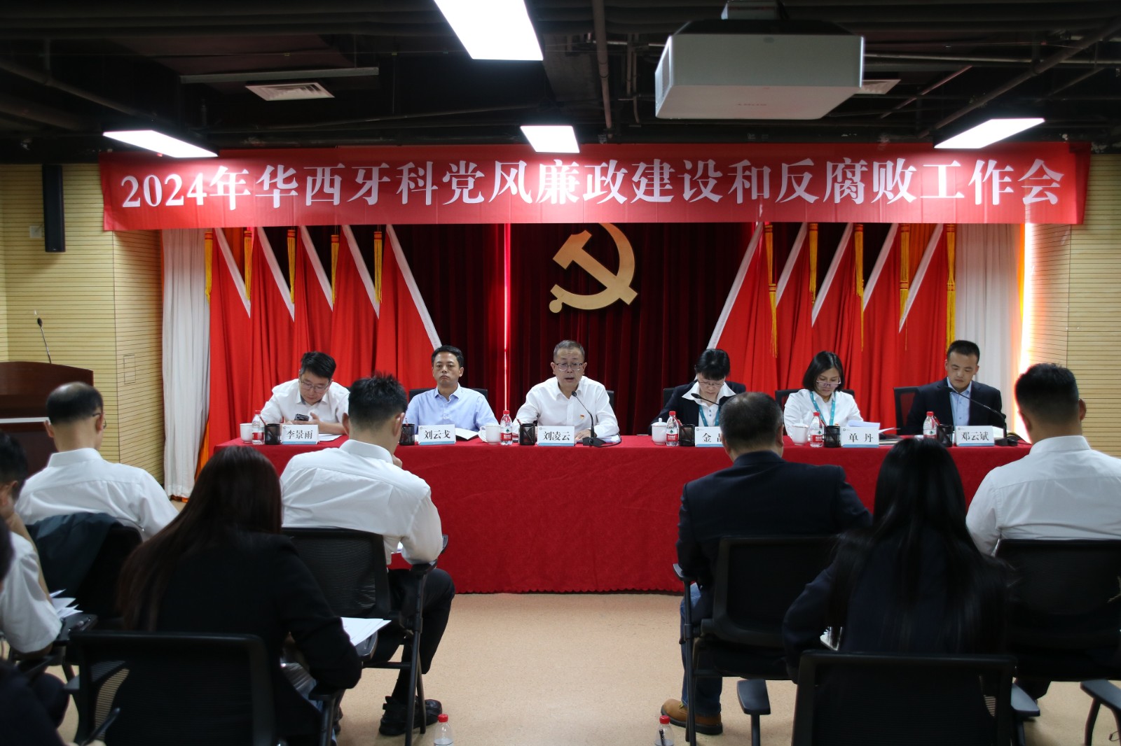 華西牙科領(lǐng)導(dǎo)班子成員出席會議,紀(jì)委委員,中層副職以上管理人員,所屬企業(yè)主要負(fù)責(zé)同志,黨員、群眾代表30余人參加會議。