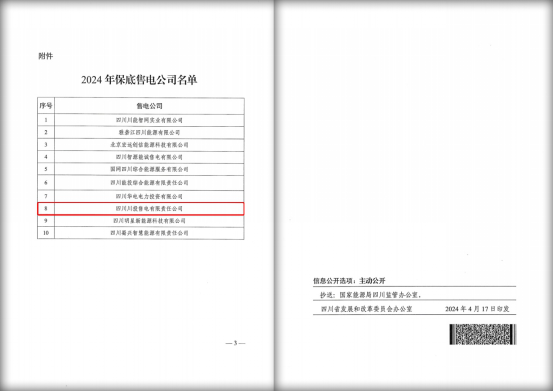 近日,省發(fā)改委、省能源局發(fā)布了《關(guān)于明確2024年保底售電公司的通知》,川投售電再次被評(píng)選為四川電力市場(chǎng)2024年保底售電公司。川投售電連續(xù)兩年獲此殊榮,是電力主管部門(mén)及各市場(chǎng)主體對(duì)川投售電經(jīng)營(yíng)能力、市場(chǎng)信譽(yù)、員工實(shí)力等各方面的認(rèn)可,更是川投售電全體干部職工腳踏實(shí)地、眾志成城、全力以赴提升公司綜合實(shí)力的具體體現(xiàn)。