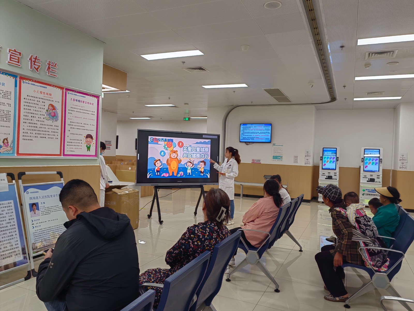 搞科普:川投西昌醫(yī)院在兒科門診等候區(qū)及住院病房區(qū)進行海姆立克急救法、兒童咳嗽處理等科普宣講。