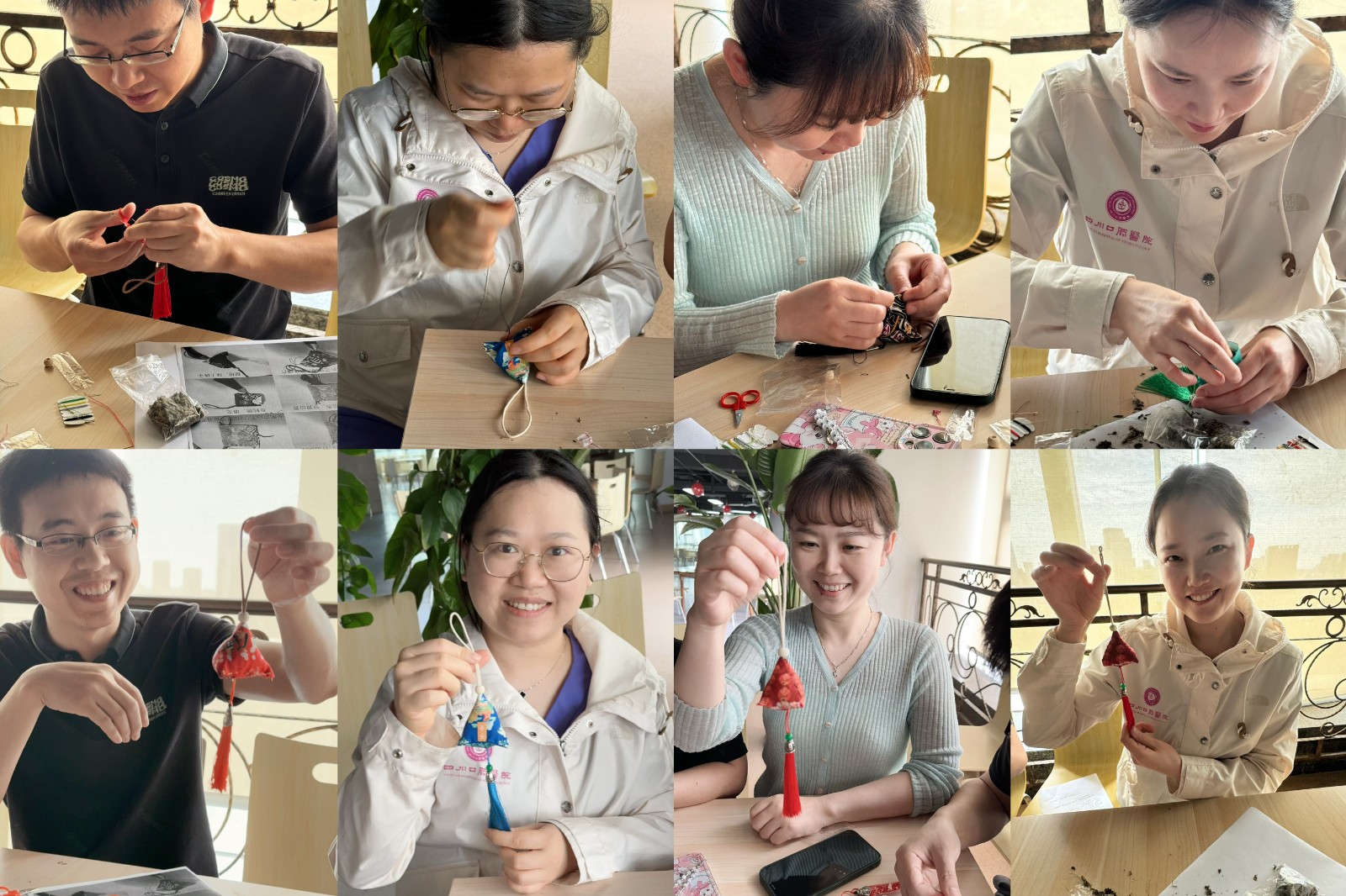 誦讀活動后,組織黨員、團(tuán)員手工制作香囊。經(jīng)過穿針引線、縫邊、裝艾草、封口、定型等工序后,完成了香囊制作。大家把制作好的精美香囊展示出來,一起交流欣賞,傳達(dá)著幸福安康的美好愿望。