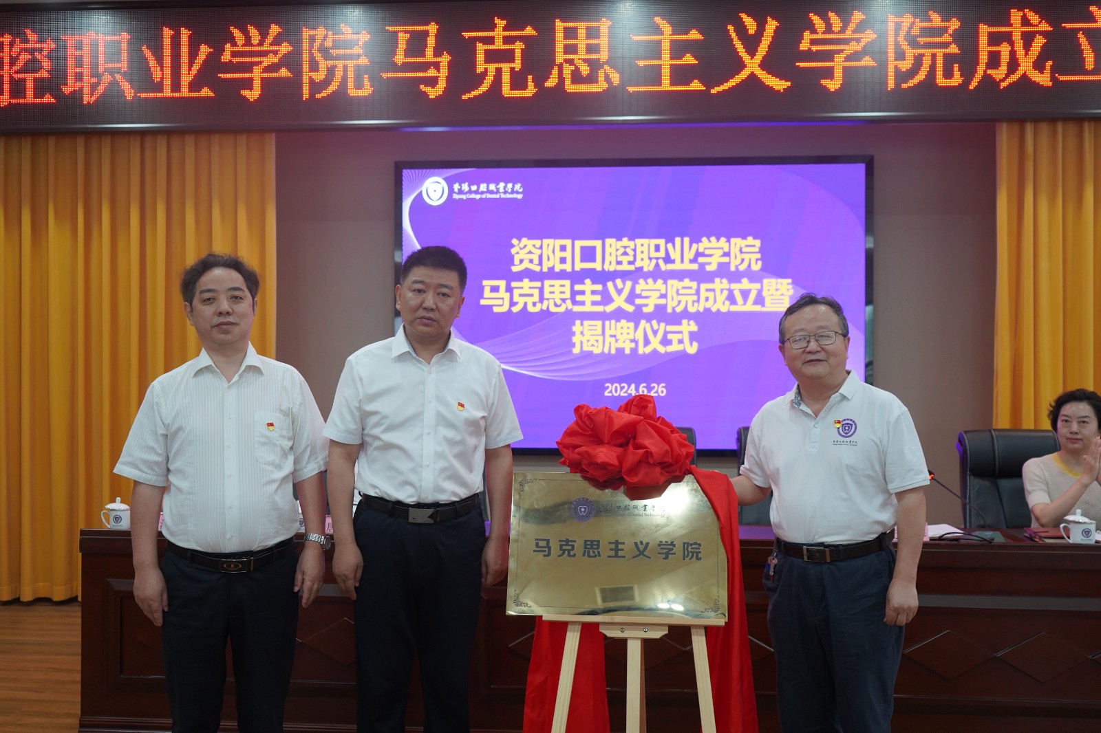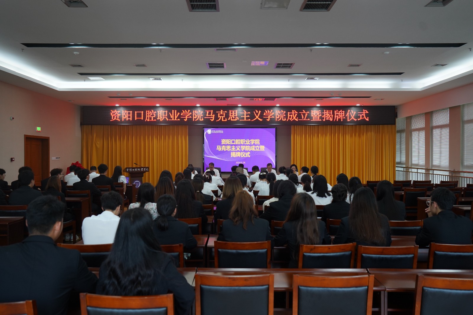 為深入學習貫徹習近平新時代中國特色社會主義思想和習近平總書記對學校思政課建設的重要指示精神,認真落實中央《關(guān)于加強新時代馬克思主義學院建設的意見》要求,推動學院馬克思主義學院建設,6月26日上午,資陽口腔職業(yè)學院舉行馬克思主義學院成立暨揭牌儀式。學院在家領導出席,各系部負責人、教師代表、全體思政教師和青馬工程班學生代表參加。