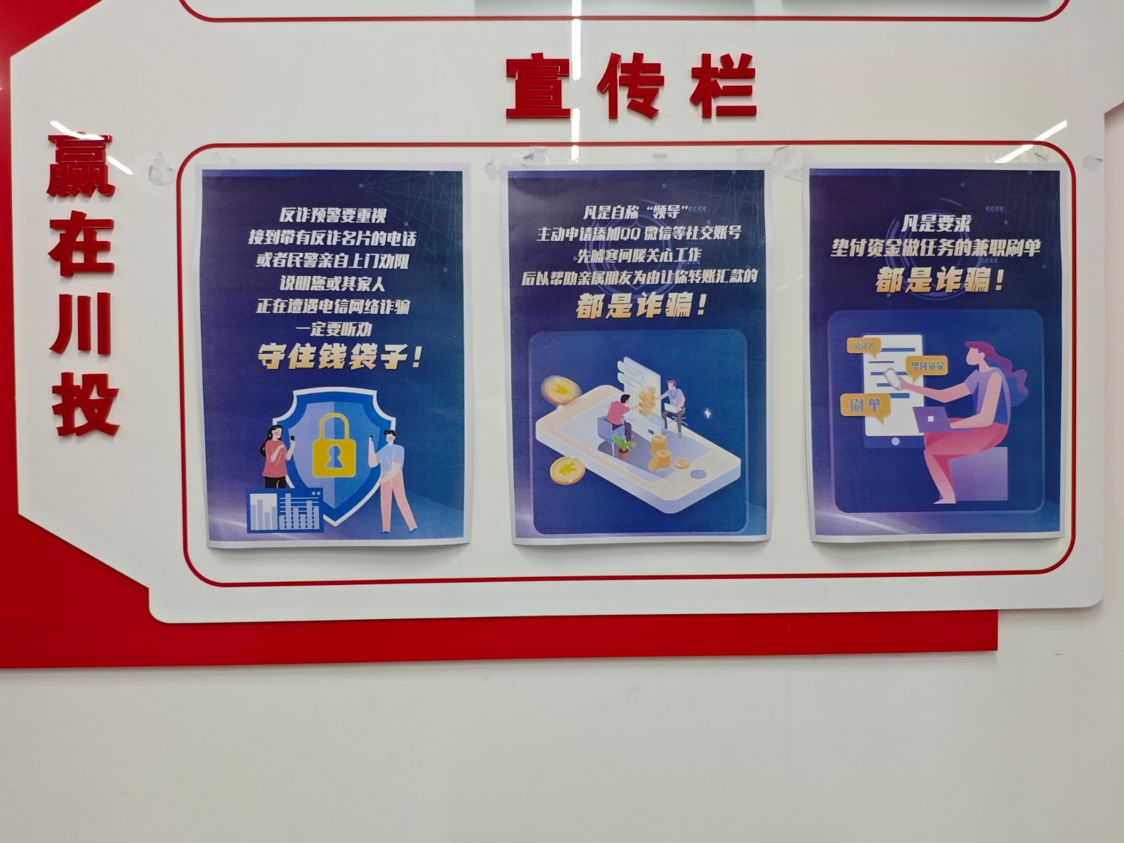 為持續(xù)營造全民反詐濃厚氛圍,切實增強全員識騙防騙意識和能力,構(gòu)建全民反詐新格局,川投匯鑫公司及所屬公司通過“線上+線下”方式,積極開展以“警惕詐騙新手法,不做電詐工具人”為主題的打擊治理電信網(wǎng)絡(luò)詐騙犯罪集中宣傳月系列活動。