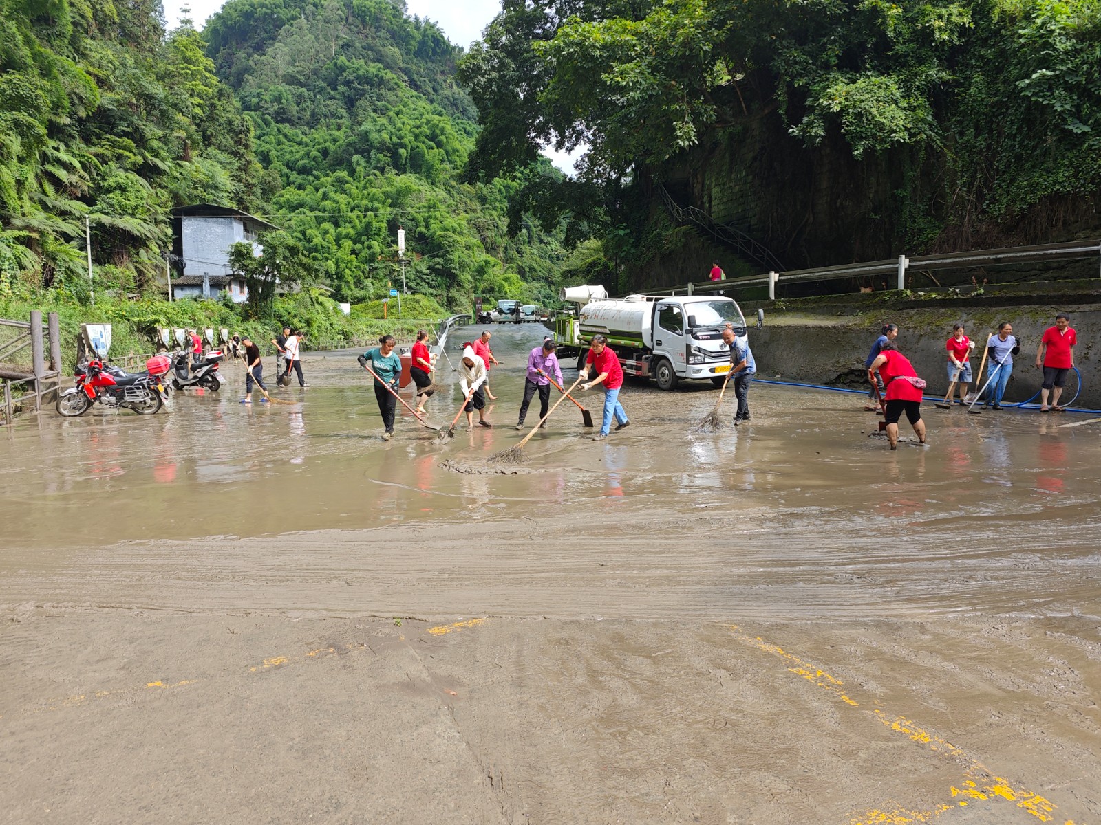 7月25日,馬邊河水逐漸退去,黨員、職工立即行動起來,頂著炎炎烈日、冒著高溫酷暑,黨員、職工們一邊用水沖,一邊用鏟刮,相互配合協(xié)同作戰(zhàn),衣服干了又濕濕了又干,卻沒有一個人叫苦叫累,經(jīng)過一整天的努力,終于在下午4點將所有淤泥全部清理干凈,泥濘的馬廟碼頭恢復(fù)往日的美麗、祥和,以嶄新姿態(tài)迎接游客們的到來。