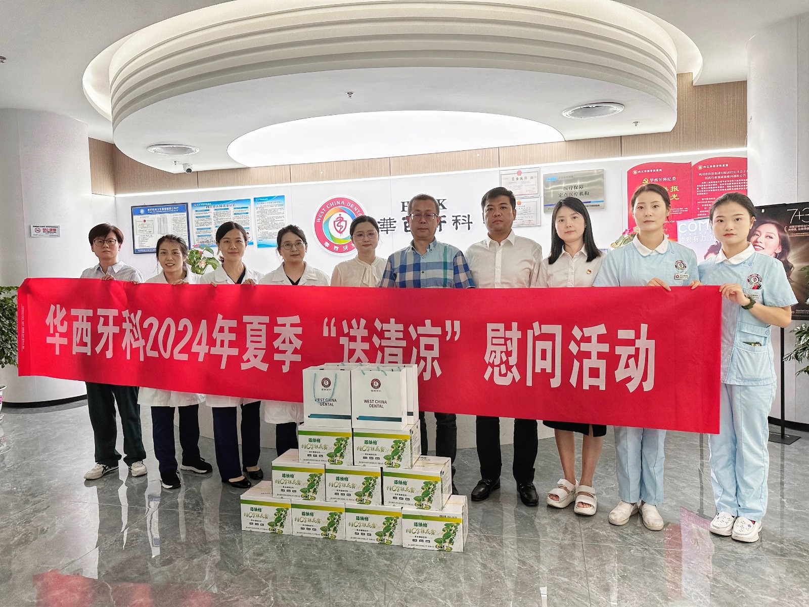 8月9日上午,華西牙科黨委書記、董事長(zhǎng)、總經(jīng)理劉凌云帶隊(duì)赴內(nèi)江華西牙科醫(yī)院開展“送清涼”慰問活動(dòng),為一線工作人員送去清涼飲料、防暑藥品等慰問品。