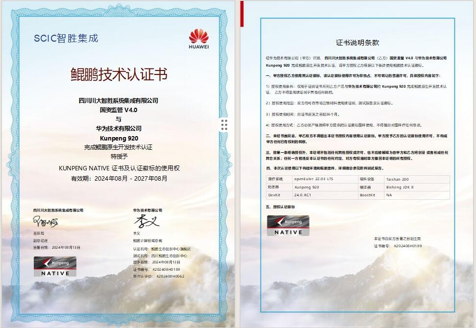 作為技術型領軍國企,智勝集成是四川鯤鵬創(chuàng)新中心首批獲取得原生開發(fā)認證的公司。值得一提的是,智勝集成國資監(jiān)管V4.0與華為技術有限公司Kunpeng 920 Taishan200獲得了鯤鵬原生開發(fā)認證,智勝集成協(xié)同辦公系統(tǒng)V4.0、數(shù)據(jù)采集交換平臺V4.0、數(shù)字檔案管理系統(tǒng)V4.0、智慧黨建信息系統(tǒng)V4.0、業(yè)務開發(fā)平臺V4.0、應用集成平臺V4.0等多項應用與華為技術有限公司Kunpeng 920 Taishan 200完成并通過相互兼容性測試認證,并積極推動華為芯片、服務器、 OpenGauss數(shù)據(jù)庫、OpenEuler操作系統(tǒng)、算力、HarmonyOS NEXT、華為PC客戶機與鯤鵬原生開發(fā)生態(tài)的深度融合,實現(xiàn)了開發(fā)效率、系統(tǒng)性能及安全性的有效提升,在業(yè)內樹立了政企協(xié)同領域應用軟件創(chuàng)新實踐的新標桿。