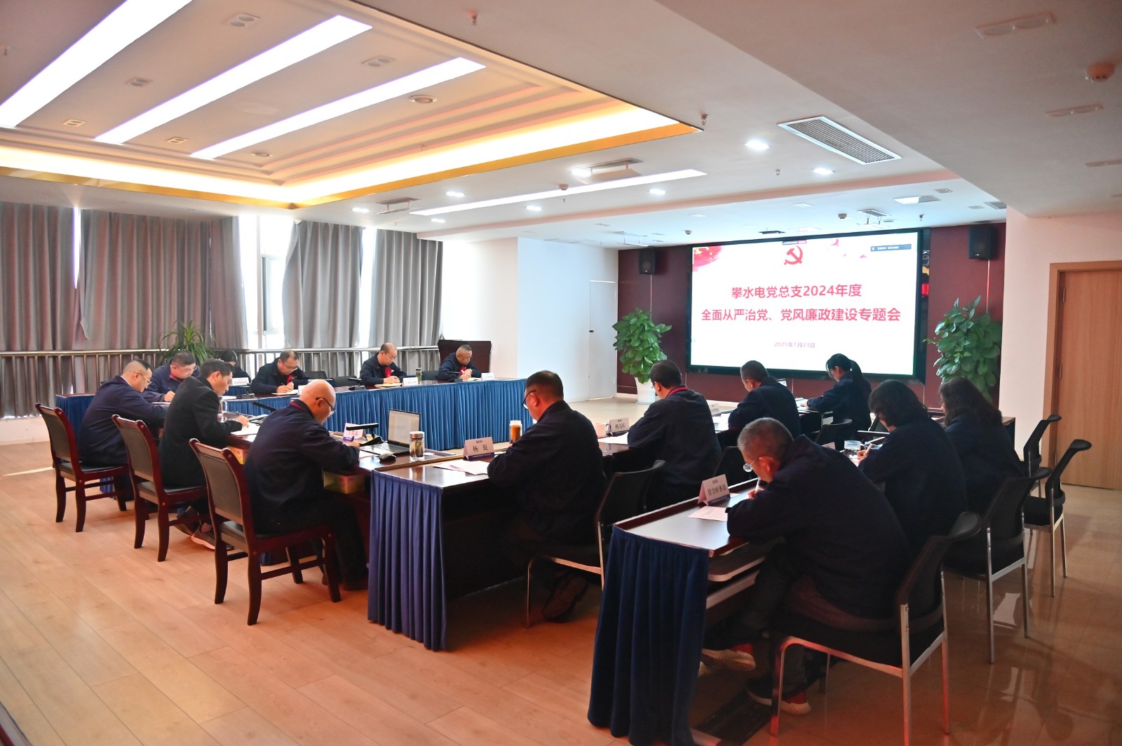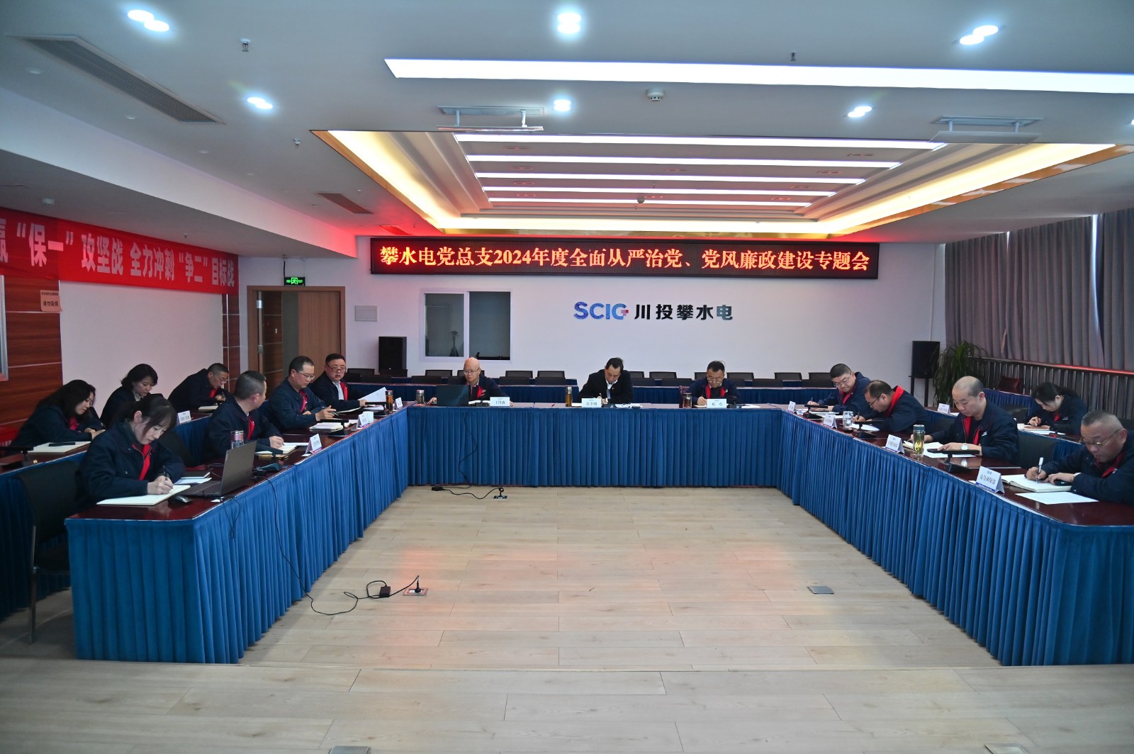1月23日,攀水電黨總支組織召開2024年度全面從嚴治黨、黨風廉政建設專題會,川投能源副總經理、攀水電公司黨總支書記、董事長徐孝剛出席會議并講話,公司黨總支委員、紀檢小組長楊銳主持會議,公司領導班子成員參加,公司各部門負責人、黨群工作部、紀檢工作部員工列席。