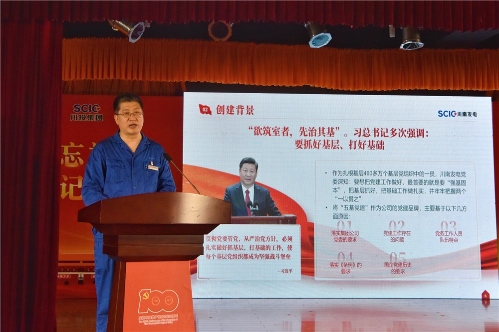 為慶祝中國共產(chǎn)黨成立100周年,縱深推進(jìn)黨史學(xué)習(xí)教育,高質(zhì)量貫徹落實《中國共產(chǎn)黨國有企業(yè)基層組織工作條例(試行)》,進(jìn)一步夯實基層黨建工作基礎(chǔ),提升基層黨組織規(guī)范化建設(shè),檢驗“強(qiáng)基固本”提升工程成效,5月12日下午,川投集團(tuán)黨委在所屬企業(yè)川南發(fā)電公司組織基層黨建工作規(guī)范化建設(shè)現(xiàn)場觀摩活動,通過法規(guī)學(xué)習(xí)、資料展示、動態(tài)演練、工作交流等方式,以達(dá)到典型引路、互幫互學(xué)、取長補(bǔ)短的目的,推動各項重點任務(wù)在基層落地落實。